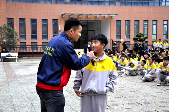 曾教官在参与演练观摩的学生中随机抽问,对学生在校车安全疏散方面的意识与认识进行“摸底”,学生们现场分享自身校车乘坐的真实体验,并与教官在校车安全逃生疏散方面开展对答交流。