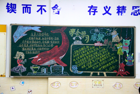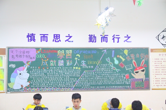 无论是初中还是高中,每一幅板报都独具特色,——一个个栩栩如生的动漫人物跃然于黑板,五彩斑斓的颜色使原本正正方方的小楷字变得丰富灵动,这一笔一画、一涂一抹无不展现着同学们对精彩人生的憧憬与渴望,彰显出各班积极向上的精神风格,焕发着活力满满的青春正能量。