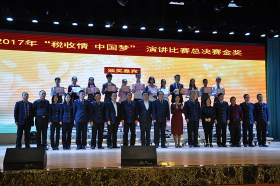 本次盛会对井盖彩绘比赛的一等奖、二等奖及年级演讲系列比赛的获奖选手进行表彰,现场揭晓“税收情 中国梦”演讲比赛总决赛金、银、铜奖获奖名单,各位领导嘉宾先后为获奖学生颁奖。
