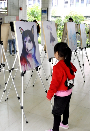 看,这个小妹妹被深深吸引了,黄广小艺术家们的作品真有魅力!