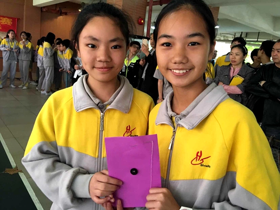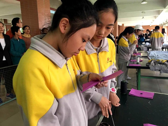 钉扣子环节要求穿针引线需要细心、耐心,竞赛现场人声鼎沸却丝毫不影响钉扣子同学组合专注操作、默契配合。