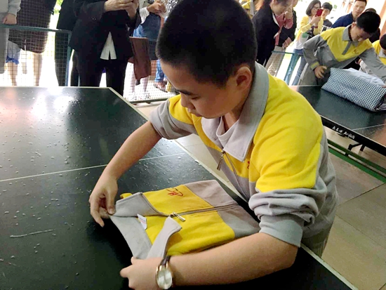 叠被子和折衣服是限时比赛,学生不但要在有限的时间内完成衣物、被褥的基本整理,还需要注重成品的“质量”——被子有无叠成豆腐块,衣服拉链的边线有无居中……每一个细节都要充分讲究才能得到专业裁判打出的高分。