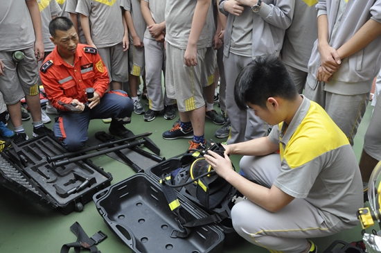 花都区危化品道路运输事故应急救援抢险队陈勇俊队长亲临黄广学校,为师生授课。陈勇俊队长兼任花都区青年志愿者协会副秘书长,多次带领队员参与省、市、区各类抢险救援行动,曾荣获广州好人、感动花都十大人物等称号。