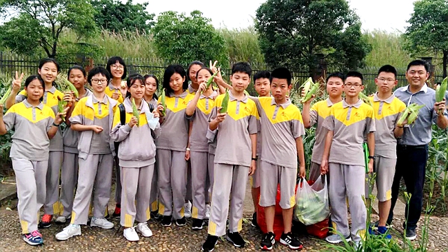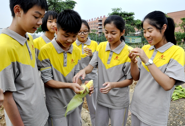 近日,黄冈中学广州学校的孩子们可好玩呢:课外活动在校园里收玉米。