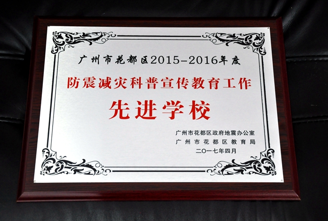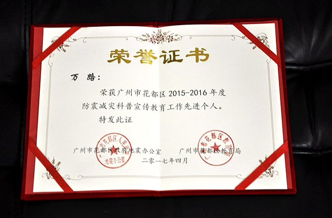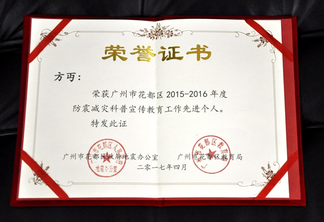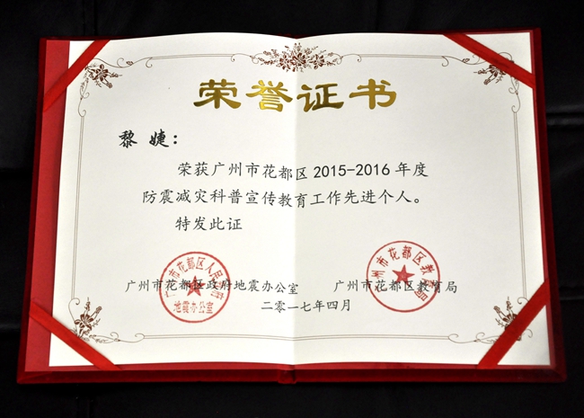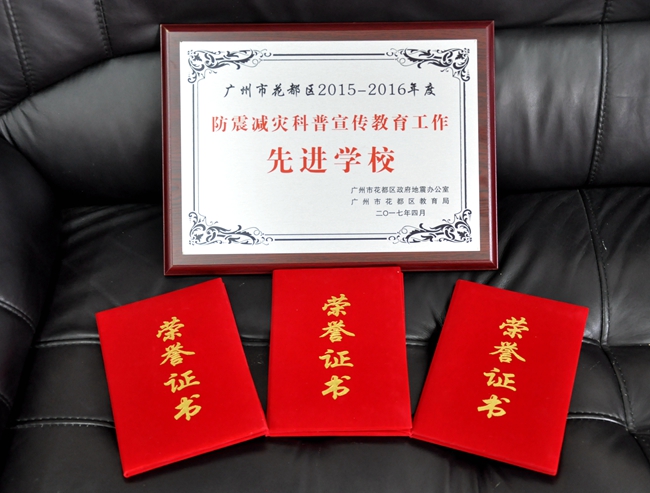 近日,广州市花都区政府地震办公室、花都区教育局颁发黄冈中学广州学校防震减灾科普宣传教育“先进学校”称号,并向学校方丏、万路、黎婕三位老师颁发“先进个人”证书。