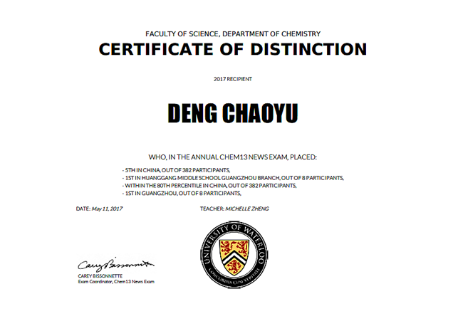 邓潮煜:2017年滑铁卢化学竞赛 , 93.75分,全国第5名;