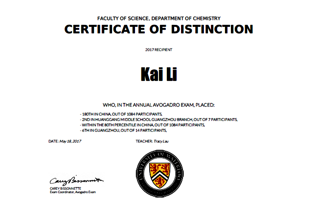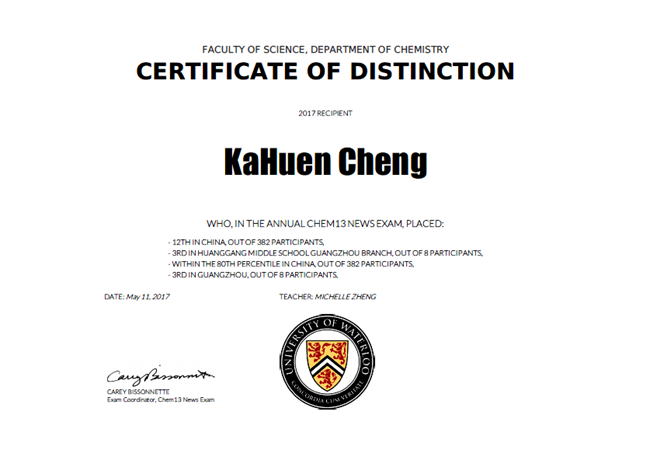 李凯:2017年滑铁卢化学竞赛,广州第6名;