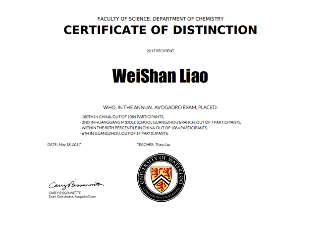 廖巍山:2017年滑铁卢化学竞赛,广州第6名;