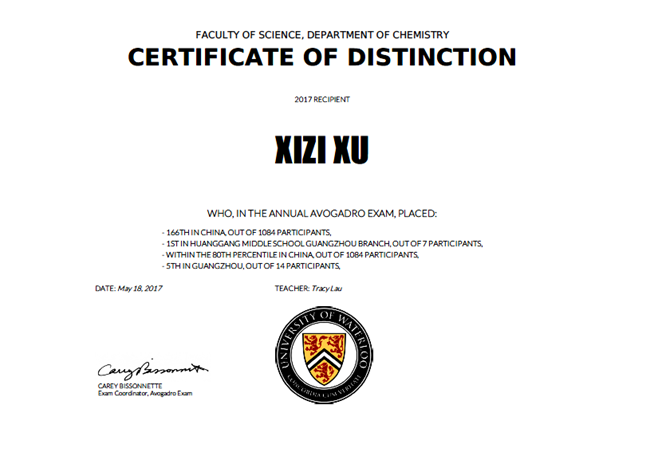 许希子:2017年滑铁卢化学竞赛,广州第5名;