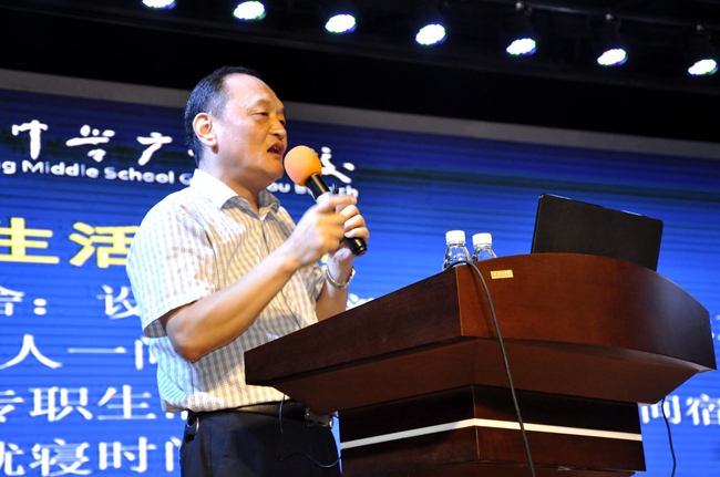 学生发展处杨文化主任作对新生家长关心的校园管理、日常饮食、寄宿生活等问题逐一介绍。杨主任从当代青少年成长发展过程中的问题出发,带领家长深入了解黄广智慧德育的科学制度与管理模式(含品德教育、行为管理、习惯养成、价值观培育等),就家校共建、形成促进孩子健康发展的强大合力提出倡议。