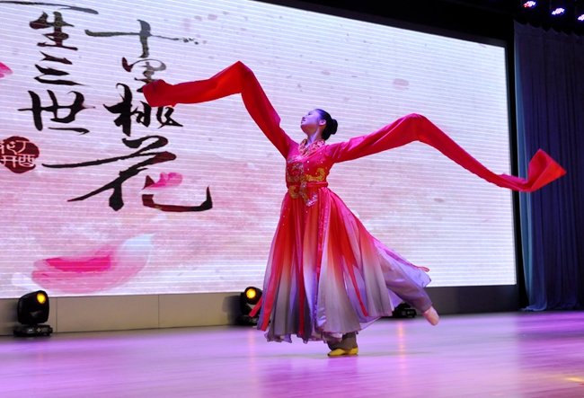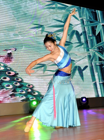 “孔雀”展姿,上场表演的老师褪去课堂上的认真严肃,化身娇美孔雀翩翩起舞,形神兼具的一动一静惊艳全场。