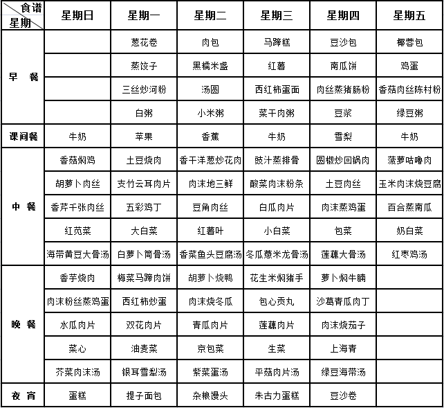 为了让家长们切实了解孩子们在校的用餐情况,学校将每周通过官方网站提前发布校园食堂菜谱,公布学生在校的一日五餐(早、中、晚餐及课间餐、宵夜)饮食情况。