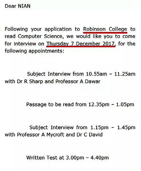(剑桥大学罗宾逊学院邀请冉念同学参加面试)