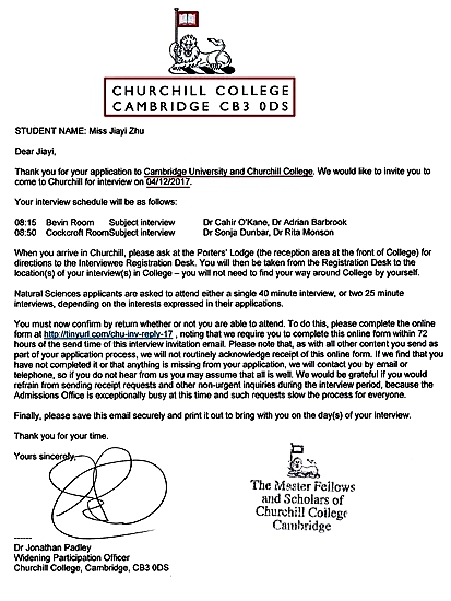 (剑桥大学丘吉尔学院邀请朱佳伊同学参加面试)