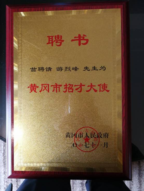 11月12日,游烈峰等四位校友获黄冈市人民政府授予“招才大使”荣誉称号。
