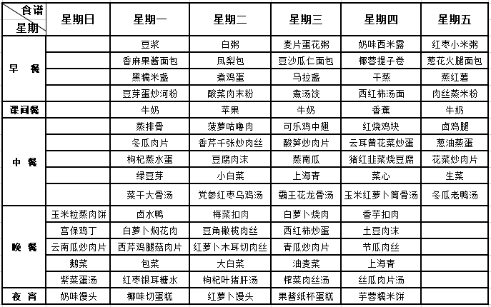 我校每周“营养菜谱”经过学校营养师审核通过,一日五餐(早、中、晚餐及课间餐、宵夜),确保膳食安全、营养、均衡、充足,满足孩子健康成长需要,敬请家长关注。