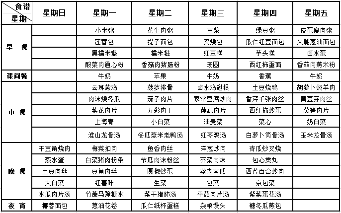 我校每周“营养菜谱”经过学校营养师审核通过,一日五餐(早、中、晚餐及课间餐、宵夜),确保膳食安全、营养、均衡、充足,满足孩子健康成长需要,敬请家长关注。