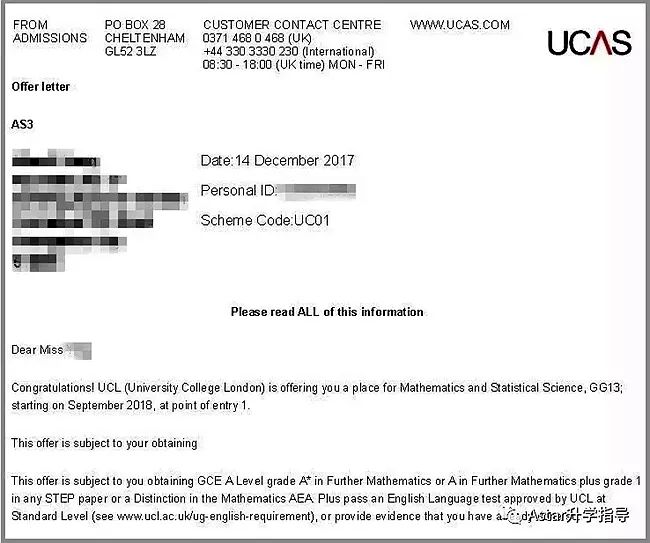 这次收到的offer是来自于伦敦大学学院(UCL)的数学和统计专业。该专业要求学生 Further Mathematics(高阶数学)达到 A*,或者Further Mathematics达到A 的成绩,同时加考STEP考试并达到1等级成绩,方能达到录取标准线。
