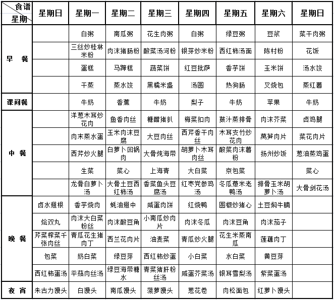 我校每周“营养菜谱”经过学校营养师审核通过,一日五餐(早、中、晚餐及课间餐、宵夜),确保膳食安全、营养、均衡、充足,满足孩子健康成长需要,敬请家长关注。