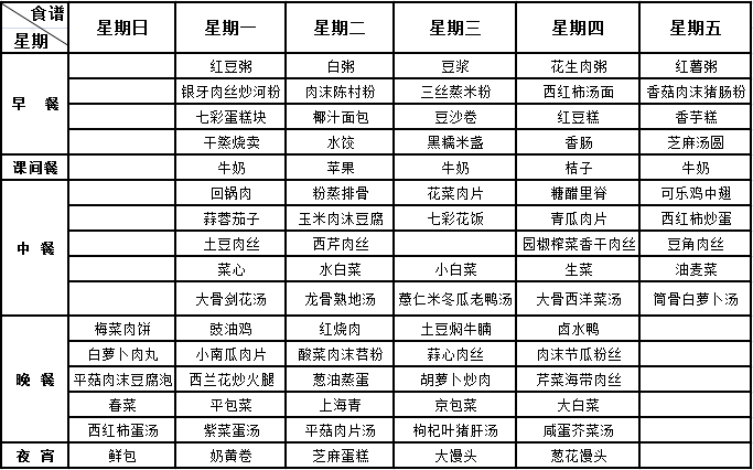 我校每周“营养菜谱”经过学校营养师审核通过,一日五餐(早、中、晚餐及课间餐、宵夜),确保膳食安全、营养、均衡、充足,满足孩子健康成长需要,敬请家长关注。