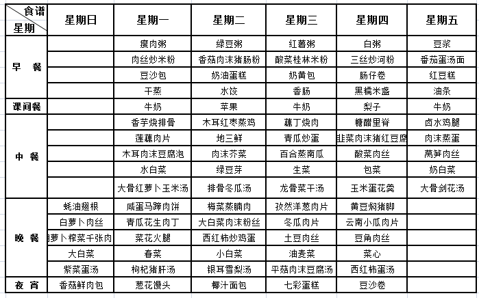 我校每周“营养菜谱”经过学校营养师审核通过,一日五餐(早、中、晚餐及课间餐、宵夜),确保膳食安全、营养、均衡、充足,满足孩子健康成长需要,敬请家长关注。