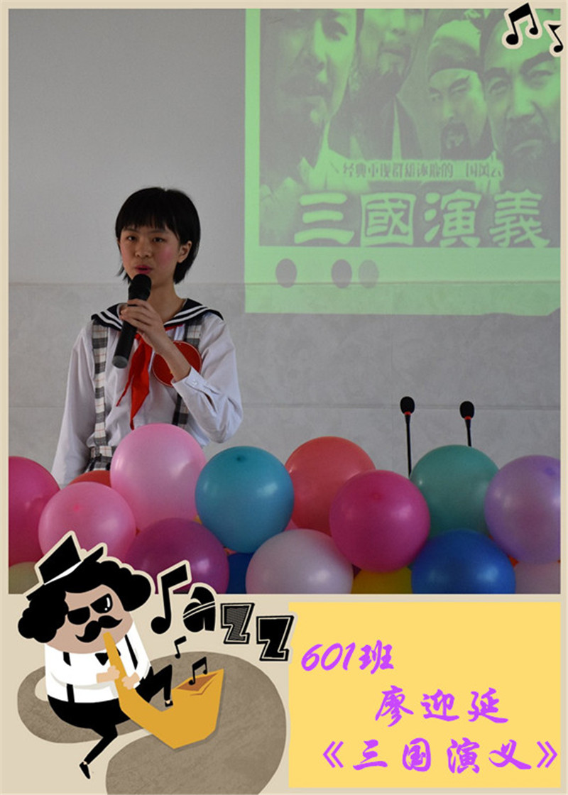 601班廖迎延同学抬手一挥,尽显大将风范。她分享的《三国演义》再现了各路英雄豪杰的独特形象,特别是诸葛亮手摇羽扇,运筹帷幄的潇洒,早已让我们内心澎湃、由衷膜拜。