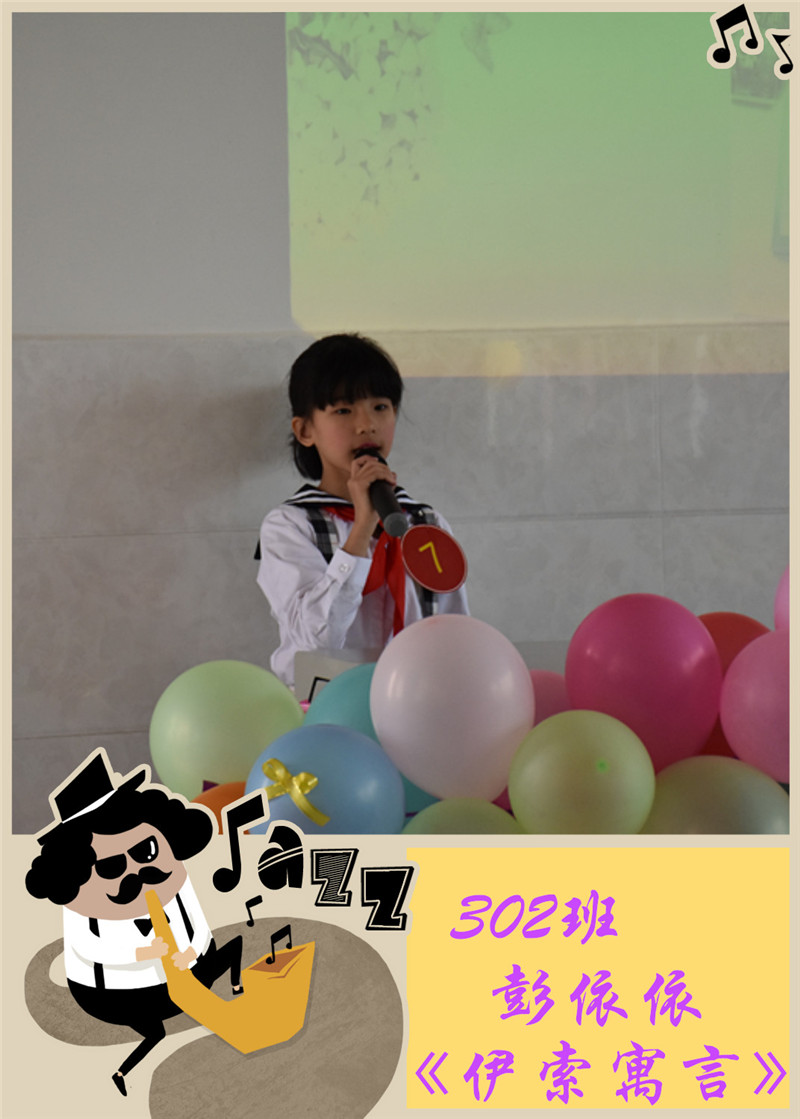 302班彭依依是个伶牙俐齿、俏皮可爱的女孩,她把《伊索寓言》里的小动物都演活了,我们在笑声中充分感受寓言故事的魅力。