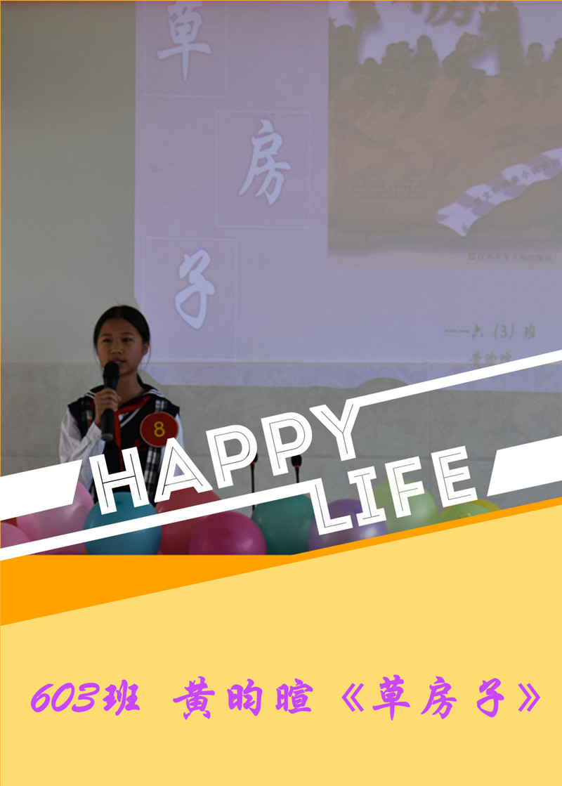 603班黄昀暄淡定从容,她声情并茂地分享了《草房子》,让我们看到孩子们在爱与被爱中的成长和在这一所草房子里闪闪发光的真善美。