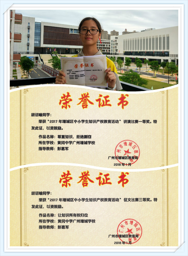 其中,胡诏喻同学还获征文比赛三等奖,获得该项比赛双丰收,成为演讲与征文“多能手”,充分展示黄广增城学校“素质教育,全面发展”的教育成果。