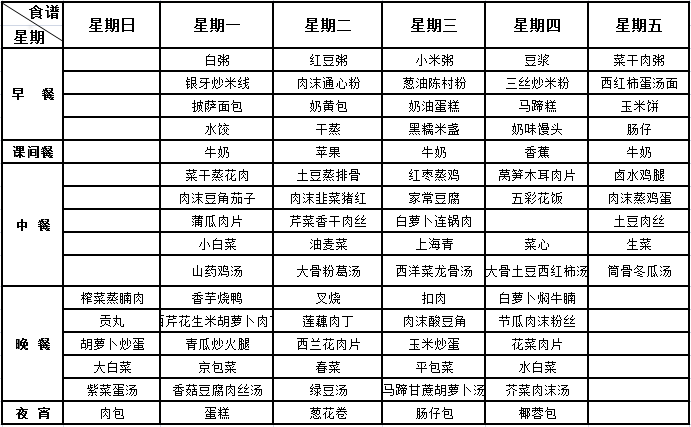 我校每周“营养菜谱”经过学校营养师审核通过,一日五餐(早、中、晚餐及课间餐、宵夜),确保膳食安全、营养、均衡、充足,满足孩子健康成长需要,敬请家长关注。