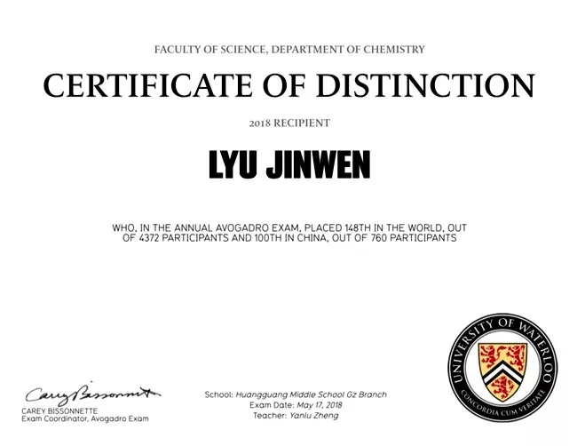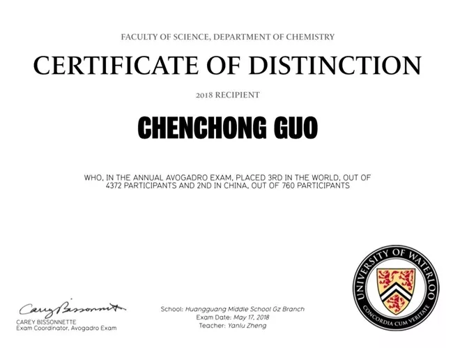 值得一提的是,早于2017年的第47届滑铁卢化学13新闻竞赛中,原国际部高二年级的邓潮煜同学首次代表黄广学校参赛即夺得全国第五名(他的A-level数理化成绩也摘得三个A*)。