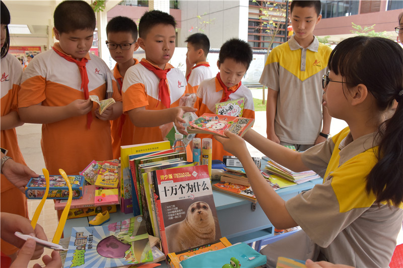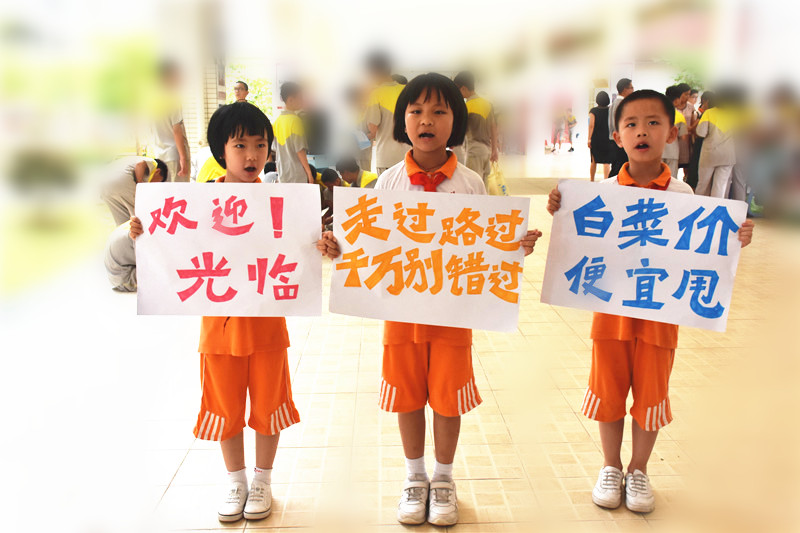 甚至有的同学拉来了大音响,像模像样地拿起话筒高声叫卖:“走过路过,不要错过,来买东西哟,这里有文具,有好看的书本……”