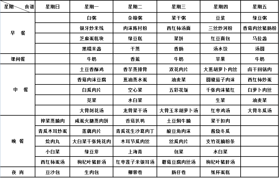 我校每周“营养菜谱”经过学校营养师审核通过,一日五餐(早、中、晚餐及课间餐、宵夜),确保膳食安全、营养、均衡、充足,满足孩子健康成长需要,敬请家长关注。