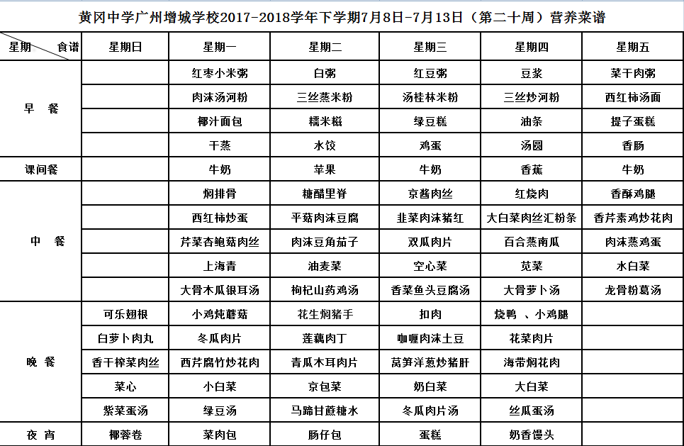 黄冈增城学校7月8日-7月13日学生食堂营养菜谱