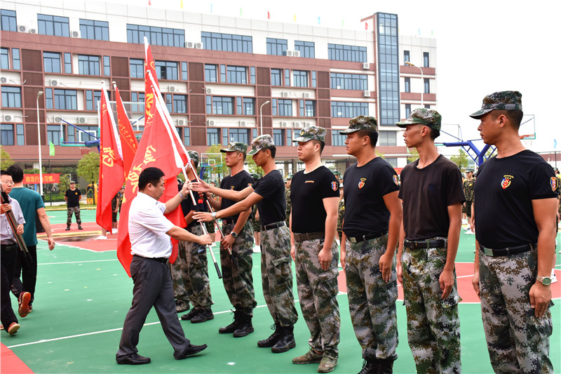 蒋晓明校长为各连队带队教官授旗:旗帜鲜红,是热情与前进的颜色;红旗飘舞,是理想与信念的展现。