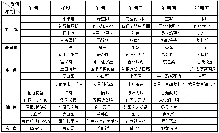 我校每周“营养菜谱”经过学校营养师审核通过,一日五餐(早、中、晚餐及课间餐、宵夜),确保膳食案例、营养、均衡、充足,满足孩子健康成长需要,敬请家长关注。