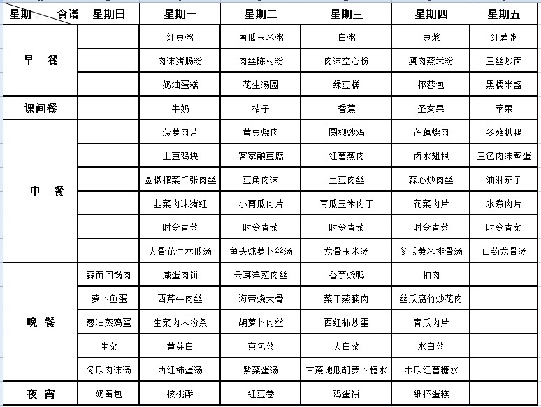 我校每周“营养菜谱”经过学校营养师审核通过,一日五餐(早、中、晚餐及课间餐、宵夜),确保膳食案例、营养、均衡、充足,满足孩子健康成长需要,敬请家长关注。