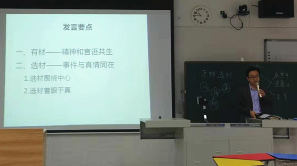 黄广增城学校张小刚老师关于“作文要做到‘有材’,还需会‘选材’;写作经验的获得就是要实践,仅说理论和方法还远远不够;写真实生活还得指向中心描写,会设置与选择性描写;教师应该带学生走出课堂,走进生活,去观察生活感悟生活”等观点得到了与会老师的高度赞扬,他的专题发言旁征博引,精彩纷呈,极具文学性与权威性,被与会教师誉为“学者型教师”。