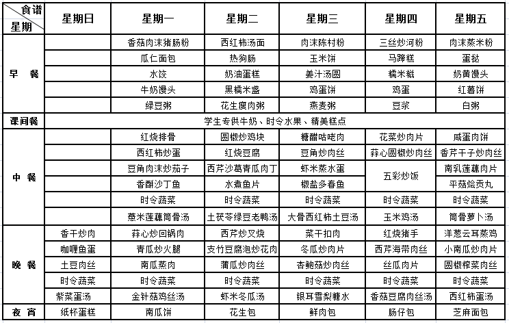 我校每周“营养菜谱”经过学校营养师审核通过,一日五餐(早、中、晚餐及课间餐、宵夜),确保膳食案例、营养、均衡、充足,满足孩子健康成长需要,敬请家长关注。
