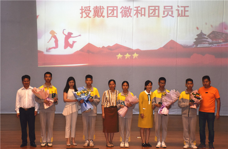 团委书记杨少涛老师宣布新团员名单,由家长代表向新团员颁发团员证、团徽。