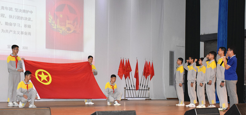 鲜艳的团旗下,新团员举起右手庄严宣誓:“我志愿加入中国共产主义青年团,坚决拥护中国共产党的领导,遵守团的章程,为共产主义而奋斗。”