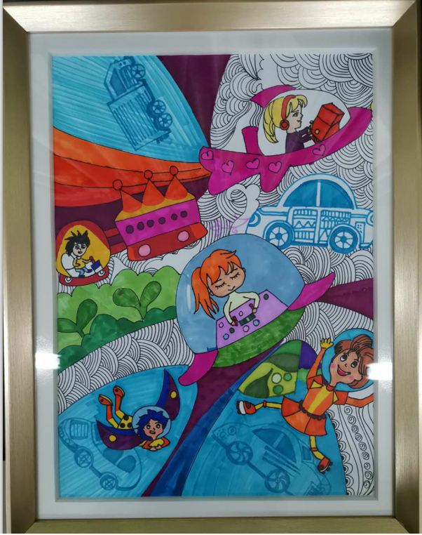 这一幅作品叫《未来的交通》,我用丰富的色彩和线条,描绘出自己心中的未来科技发展的样子。