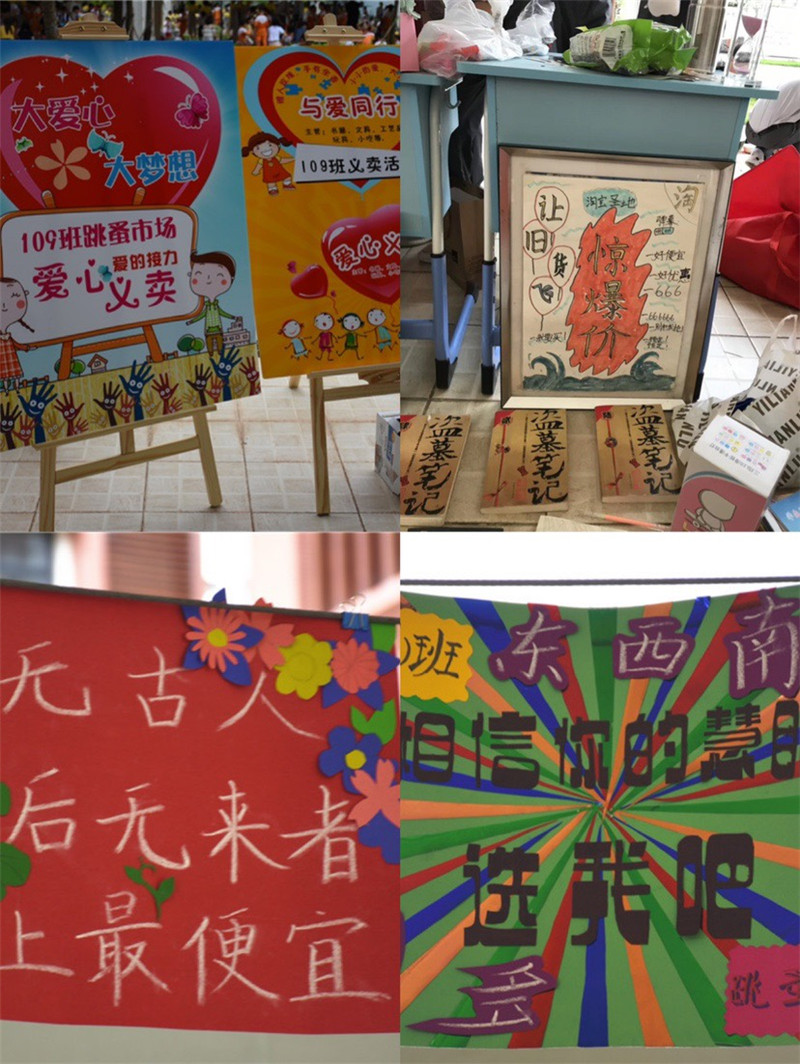 一大早,同学们就开始布置自己的摊点:有的在摊位前挂起了DIY宣传海报,有的在细心地为商品进行分类并贴好价格标签……