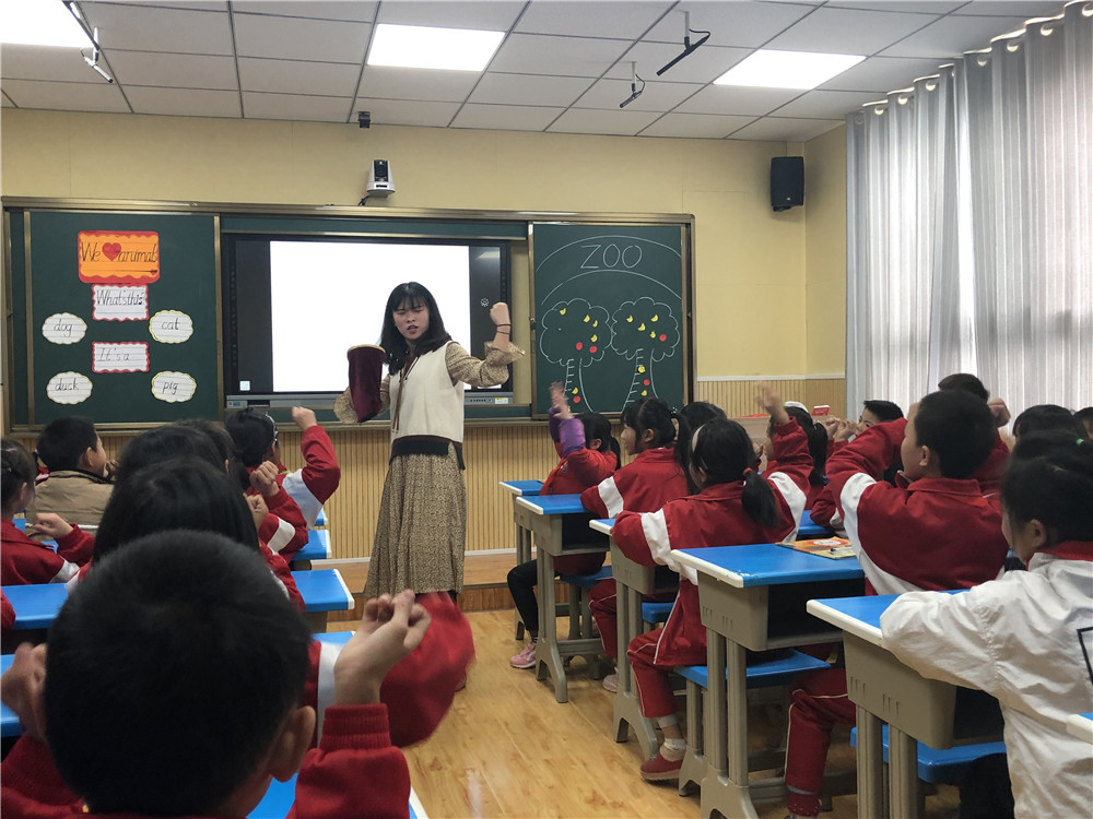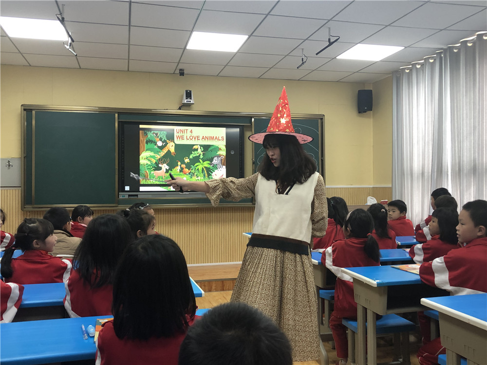 黄广增城学校双语班的骨干英语教师张洁婉老师走进三年级英语课堂,课堂上,孩子沉浸在温柔可爱的洁婉老师纯正标准的发言中,一个个动物的词汇像跳动的音符回荡在课室中。