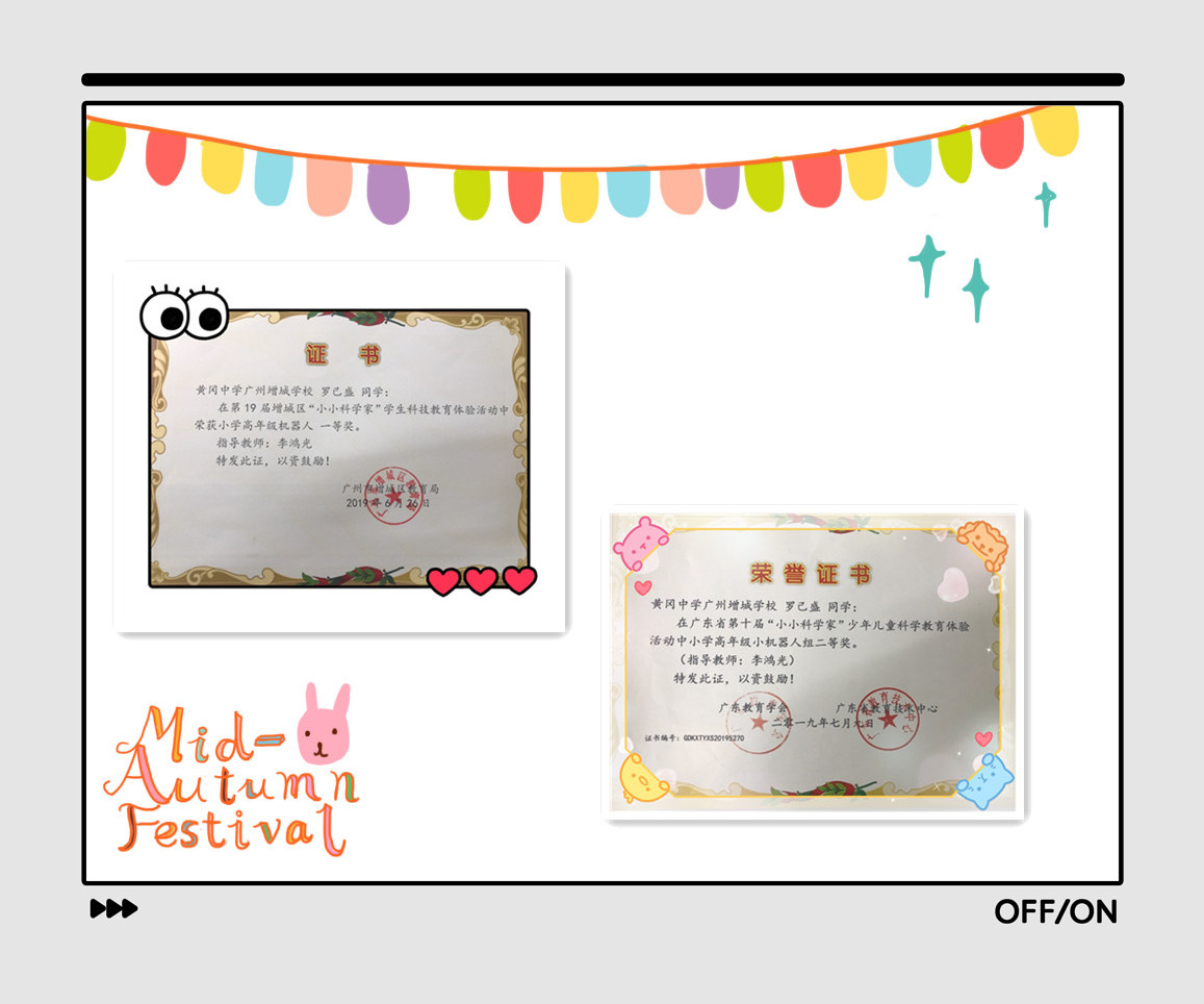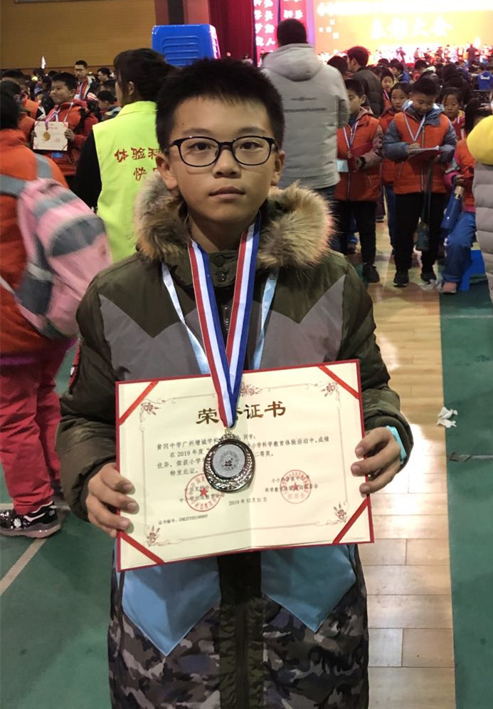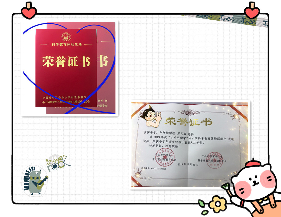 在全国总决赛中,罗己盛同学制作的悬崖侦测机器人,凭着作品的外型美观、车身的稳定程度、传感器的功能使用及机器人的综合性能等方面的测评中成绩优异,最终在全国一千两百多名学生激烈角逐中脱颖而出,获得“小小科学家”教育体验活动全国赛二等奖的好成绩。