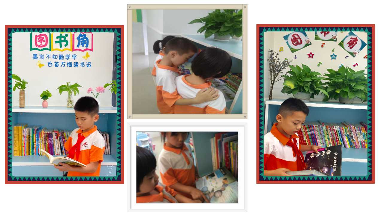 “图书角”——班级常规阅读“阵地”。小小角落,两个书柜,百余册书,却成了孩子们阅读的小天地:课间十分钟,站立柜旁,读得有滋有味,浑然忘却旁边走动说话的同学的存在;阅读课时间,群起取书,端坐桌前,沉迷书中,教室静若无人……