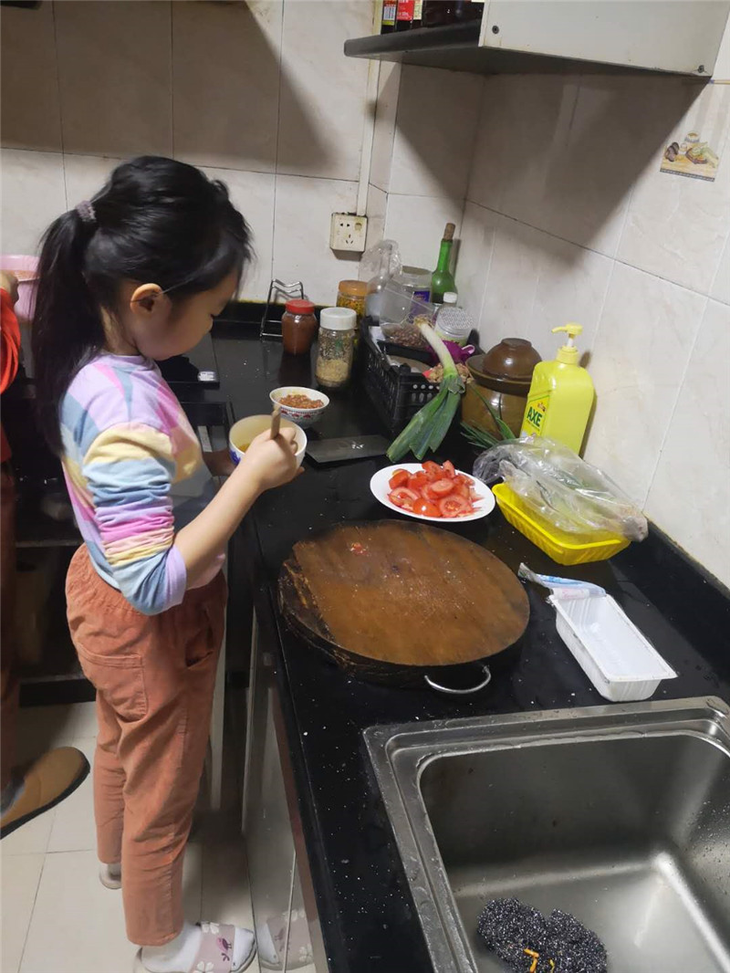 在我全程指导的过程中,发现孩子不会洗菜、不会切菜、不会拿锅铲,甚至不敢关火,我不禁担心。