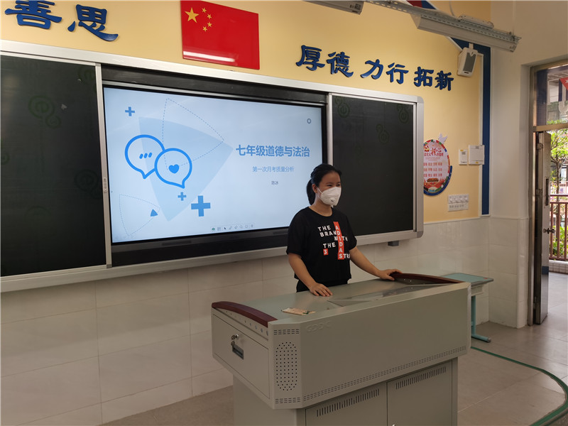 王主任首先充分肯定全体教师网课以来同心同德、顾全大局,严格执行学校教学计划,精心组织网上课堂教学。同时通过智学网数据库从纵横两方面比较、分析了这次教学质量,并与上学期末等前几次质量进行比对,宏观把握学科发展态势,微观分析学科优劣现状,结合巡堂、网课情况反馈,及时汇总商讨优化策略,紧盯规范行为是七年级作为初中起始阶段强化的重点,指出目前网课教学改进的方向。
