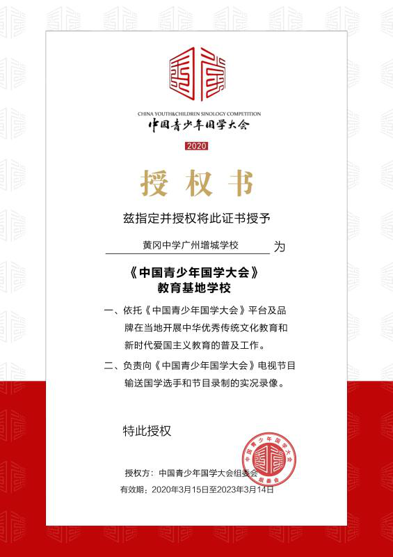 近日,黄冈中学广州增城学校(简称黄广增城学校)被授予全国百所“中国青少年国学大会”教育基地学校。