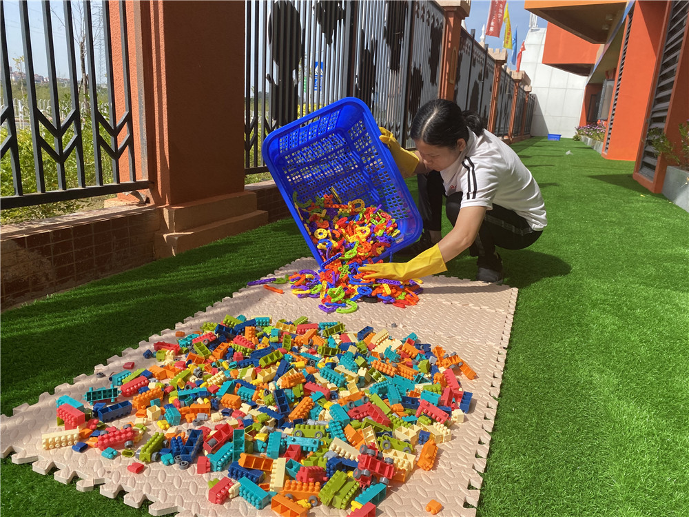 幼儿园大型玩具、公共活动区域定期用稀释后的消毒水擦拭,用清水冲洗干净,用清洁布擦干,草皮也会请专业人员定期消毒。